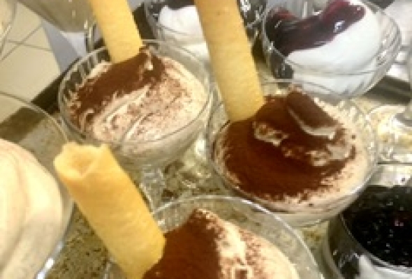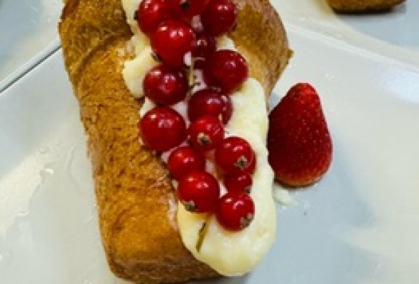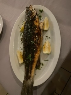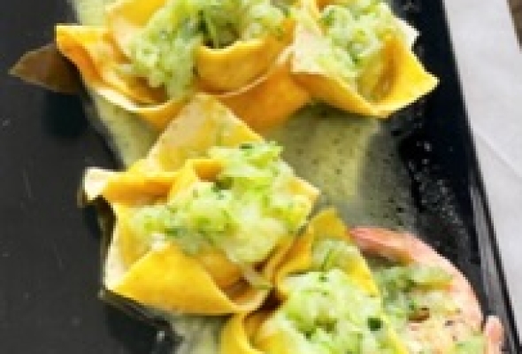 Alici spiedino di gamberi e verdure seppia su mousse di patate