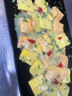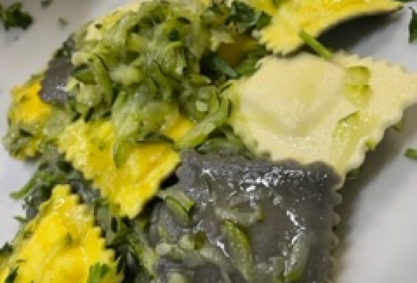 Sfoglia al nero di seppia ,curcuma e estratto di limone Ripieno crema di patate zucchine e salmone