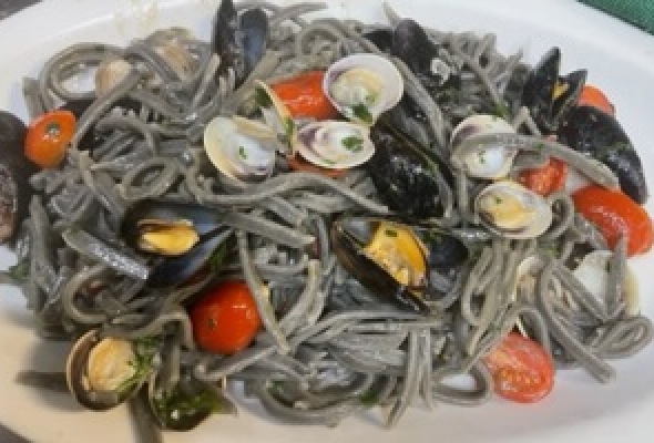 Scialatelli nero di seppia lupini cozze datterini e prezzemolo