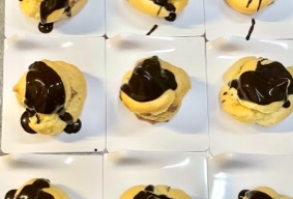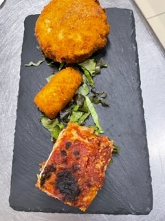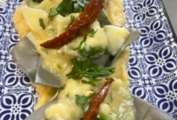 Ripieno patate e baccalà’ tortello al nero di seppia ceci e pomodoro secco